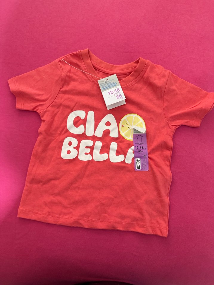 Kız çocuklar için pamuklu, kırmızı, baskılı ve fitted kesim kısa kollu tişört. Üzerinde 'CIAP BELLA' yazısı ve limon baskısı bulunur. Yuvarlak yaka ve rahat kesim. 12-18 ay Tshirt yurtdışı etiketli