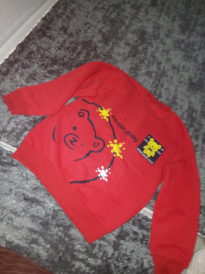 Uzun kollu, yuvarlak yakalı kırmızı sweatshirt, yumuşak kumaştan ve bol kesim. Renkli baskılı ayı deseni ve örgü detaylarıyla trend günlük stil için uygundur.