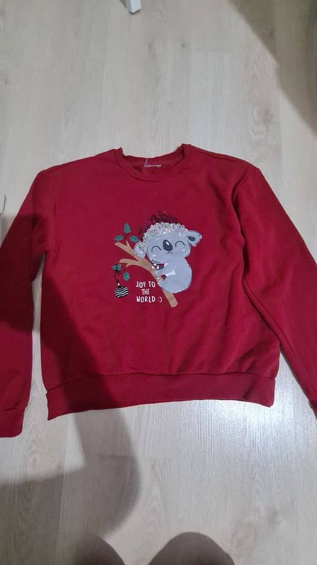 Kırmızı renkli, yuvarlak yakalı ve uzun kollu kız çocuk sweatshirtü. Yumuşak, sıcak kumaştan üretilmiş, renkli koala baskısı ve 'JOY TO THE WORLD :)' yazısı bulunur. Örgü dokusu rahatlık sağlar.