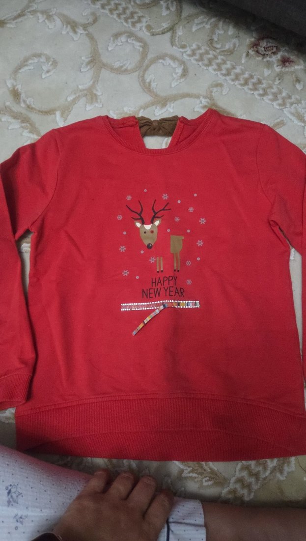 Kız çocuk için yumuşak fleece kumaştan, uzun kollu, bisiklet yaka, renkli geyik baskılı, bol kesim kırmızı sweatshirt.