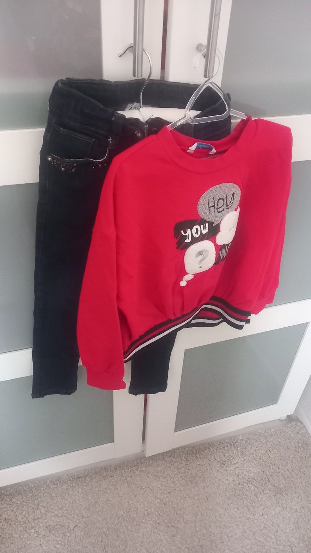 Kız çocuk için uzun kollu, bol kesim kırmızı sweatshirt. Yumuşak ve sıcak tüylü kumaştan, yapışkan bantlı ve "Hey" ve "you" yazılı baskılı tasarıma sahip.