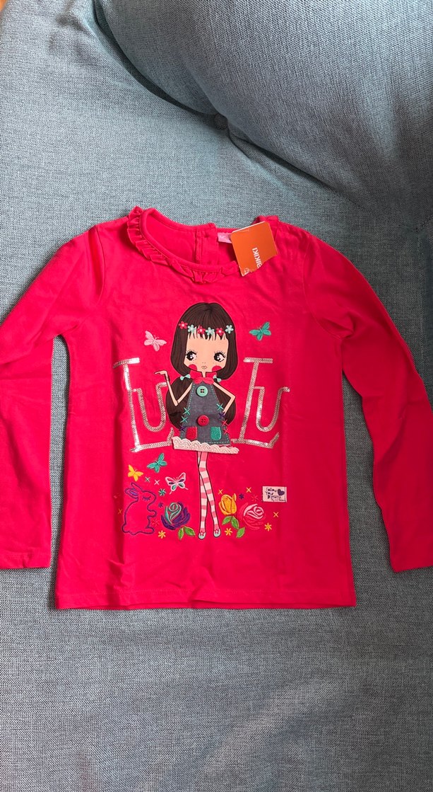 Renkli kırmızı uzun kollu kız çocuk tişörtü, bol kesim ve fırfırlı yuvarlak yaka içerir. Baskılı desenli, yumuşak ve sıcak kumaştan, rahat sokak tarzı için uygundur.