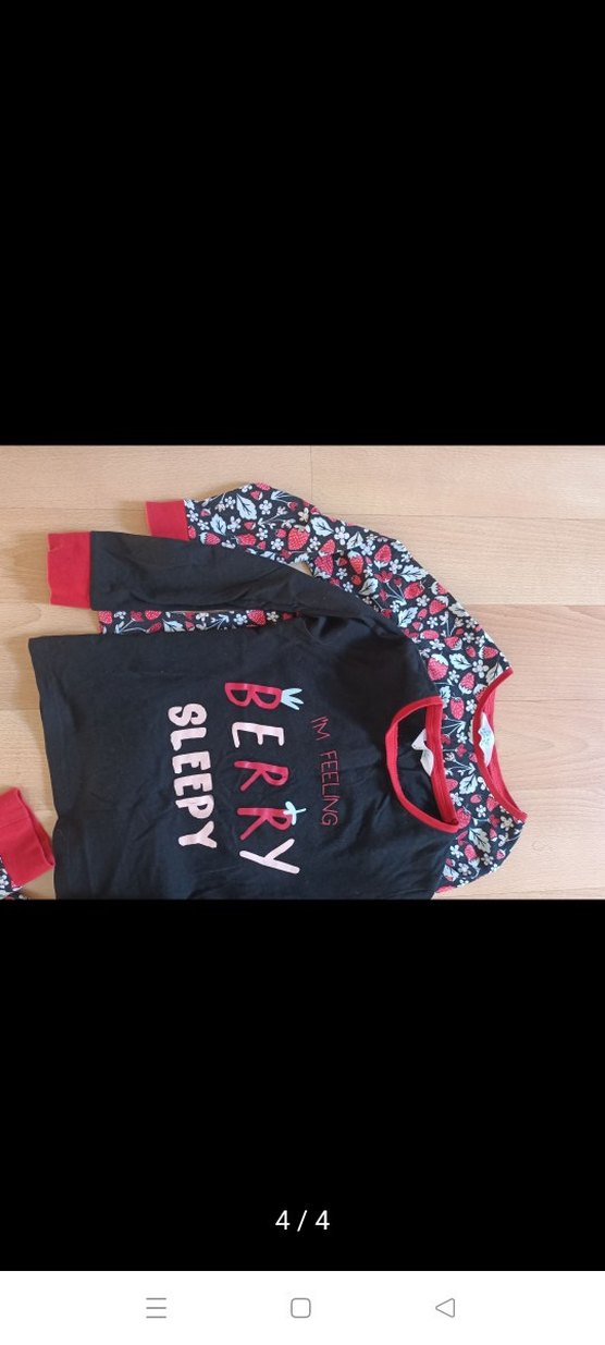 Koyu kırmızı ve siyah renklerde, baskılı, uzun kollu kız çocuk tişörtü. Yuvarlak yaka ve örme sentetik kumaştan, önünde "SLEEPY" ve "BERRY" yazıları bulunur. iki takım
