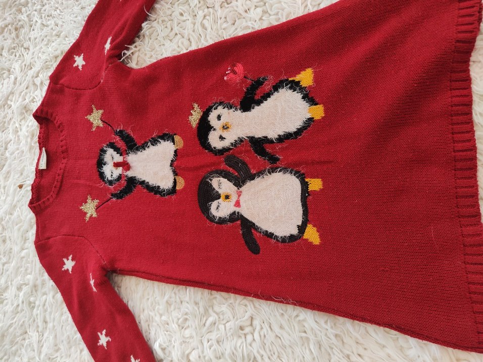 Kırmızı boğazlı, uzun kollu, vücuda oturan kazakta kürklü nakışlı penguenler bulunur. Canlı renkli bohem tarzda bir kazak.