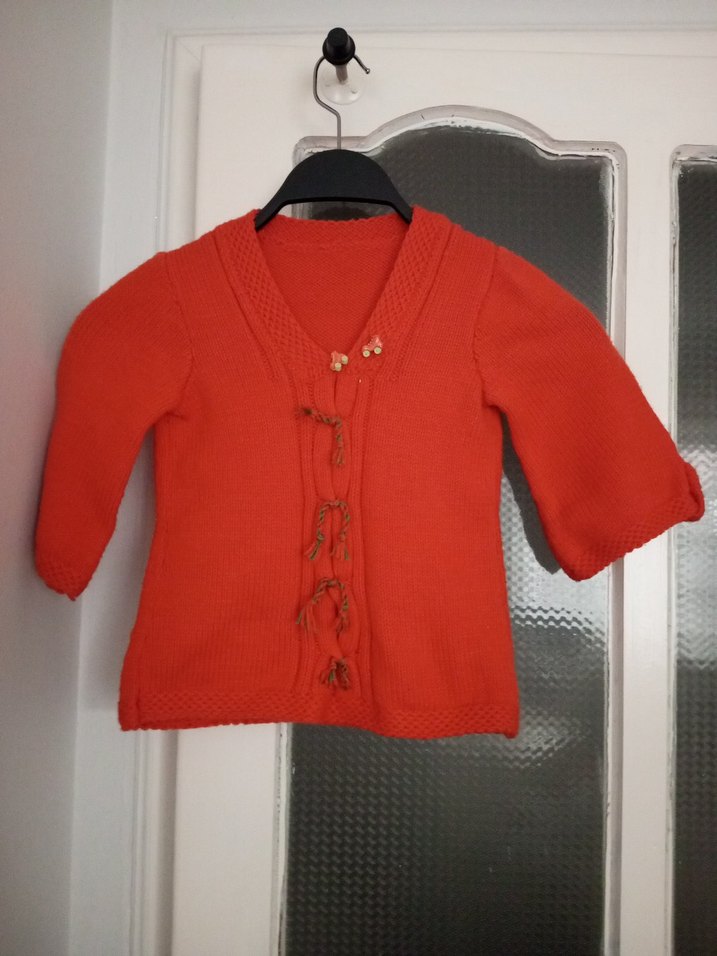 Renkli kırmızı bohem tarzı kız çocuk hırkası, düğmeli ve uzun kolludur. Örme kumaştan üretilmiş, bol kesimdir. buliz