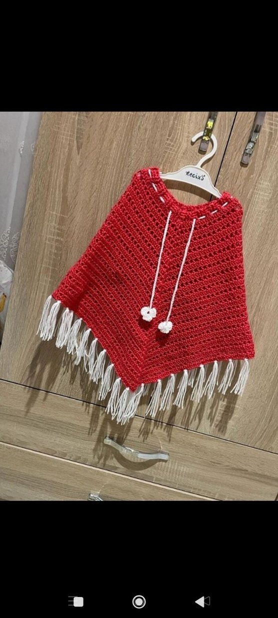 Kız çocuklar için renkli kırmızı panço, bol kesim ve kolsuz tasarıma sahiptir. Örgü, nakış detaylıdır ve püsküllü etek ucu ile tamamlanmıştır. kız çocuk örgü panço hiç kullanılmadı 3 4 yaş uyumlu olur diye düşünüyorum hata olmaması için ölçü verebiliriö marka temsili #çocukpanço #panço