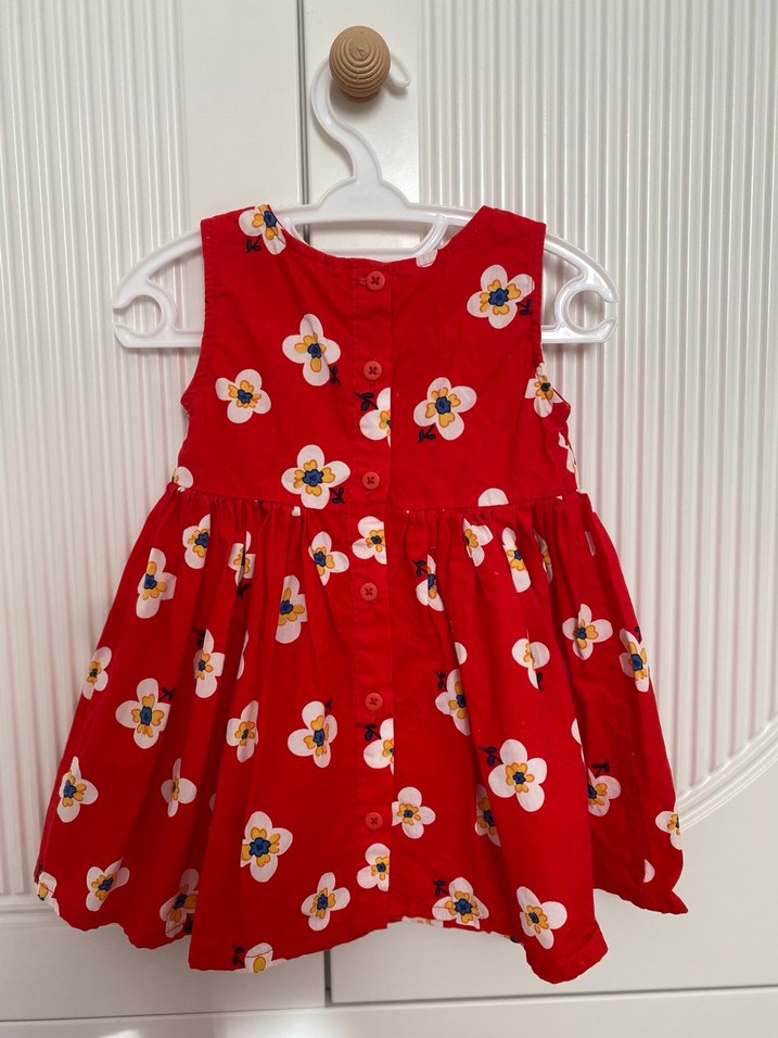 Kız çocuklar için renkli kırmızı elbise, askısız yaka ve düğmeli arkaya sahiptir. Yumuşak tekstil kumaştan, vintage çiçek desenli ve bol kesimdir.