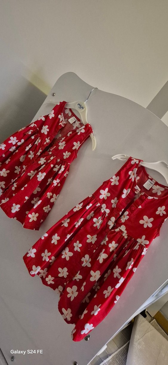 Pamuklu kumaştan, düğmeli,kırmızı çiçek desenli, kız çocuk elbisesi. biri 18-24 diğeri 24-36 beden. ikili fiyattır