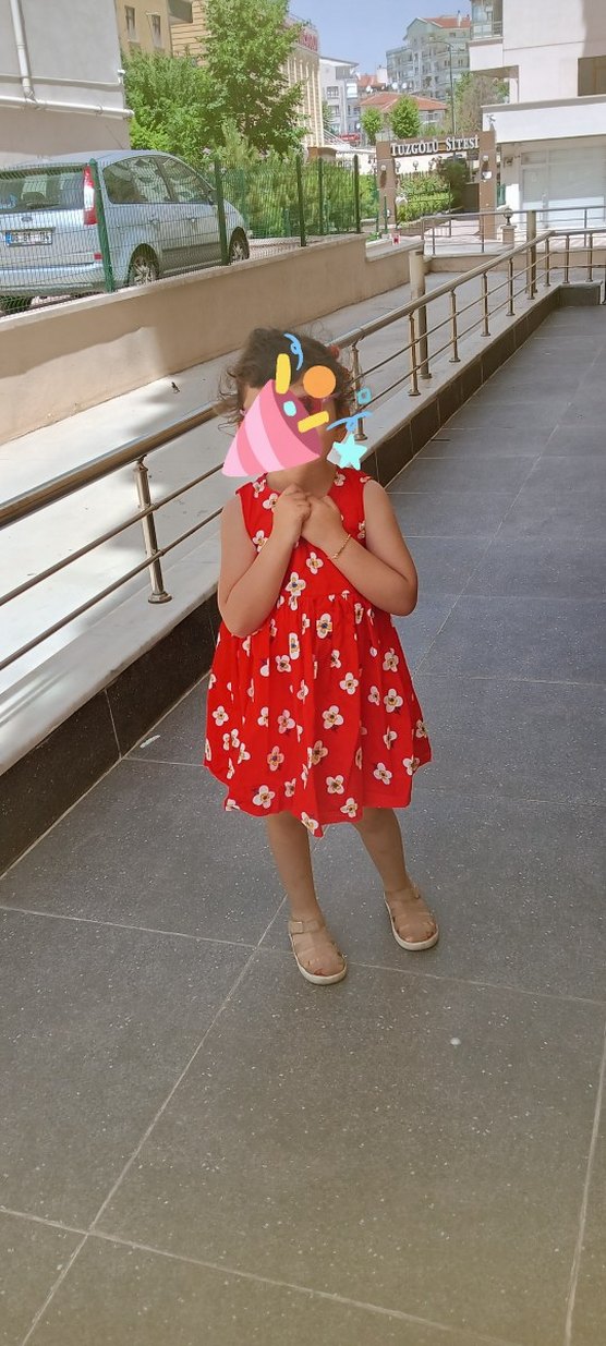 Kırmızı, V yaka ve fırfır detaylı bol kesim elbise. Canlı çiçek desenleri ve askılı kollarıyla, yumuşak sentetik kumaştan bohem tarzda. 4 5 yas sorunsuz