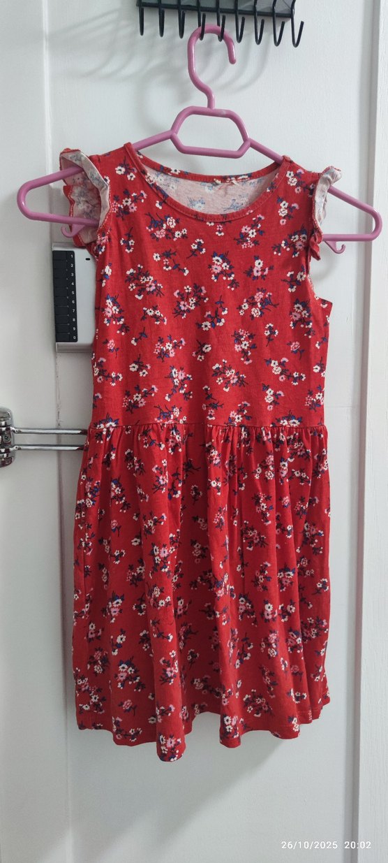 Kolsuz, omuzlarında fırfır detaylı, renkli çiçek desenli kız çocuk elbisesi. Rahat kesim ve yuvarlak yaka, yumuşak tekstil kumaştan yapılmıştır.