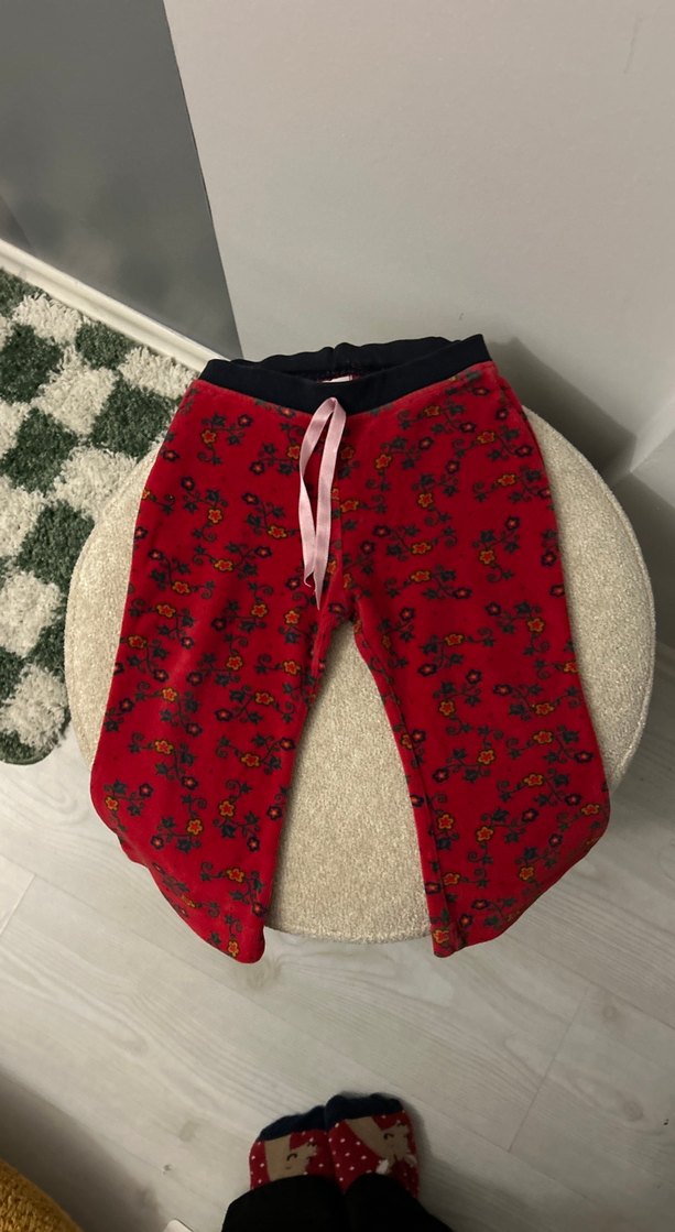 Koyu kırmızı, çiçek desenli, bol kesim kız çocuk pantolonu. Fermuarlı detaylı, yumuşak ve sıcak kumaştan üretilmiştir. Bohem tarzına uygundur.