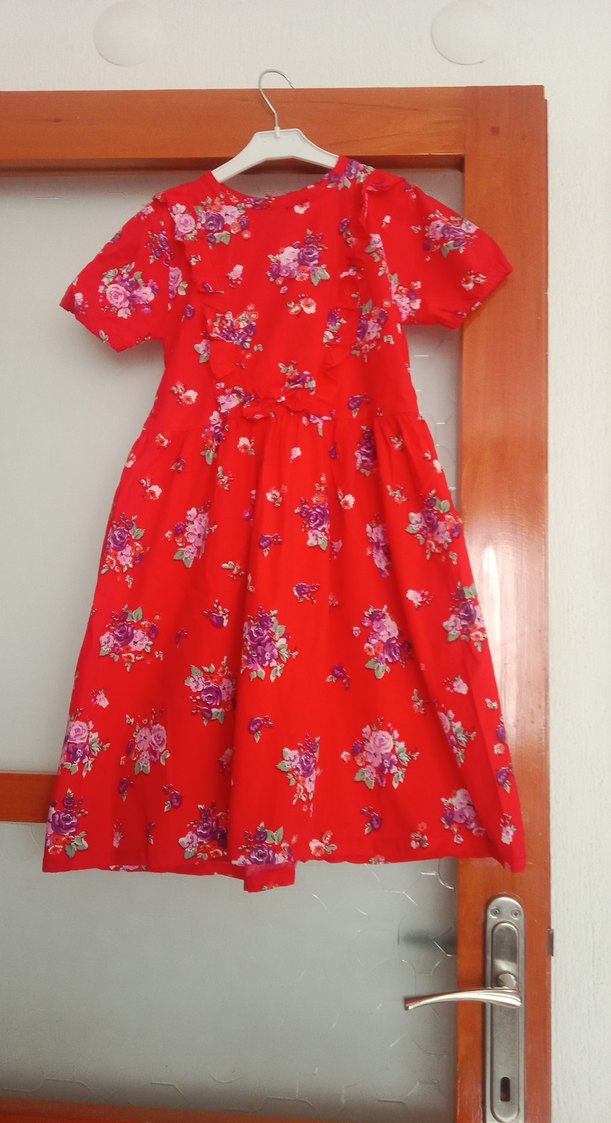 Kız çocuk elbisesi kısa kollu, fırfırlı detaylı ve renkli çiçek desenli. V yakalı, bol kesim ve yumuşak sentetik kumaştan yapılmıştır.