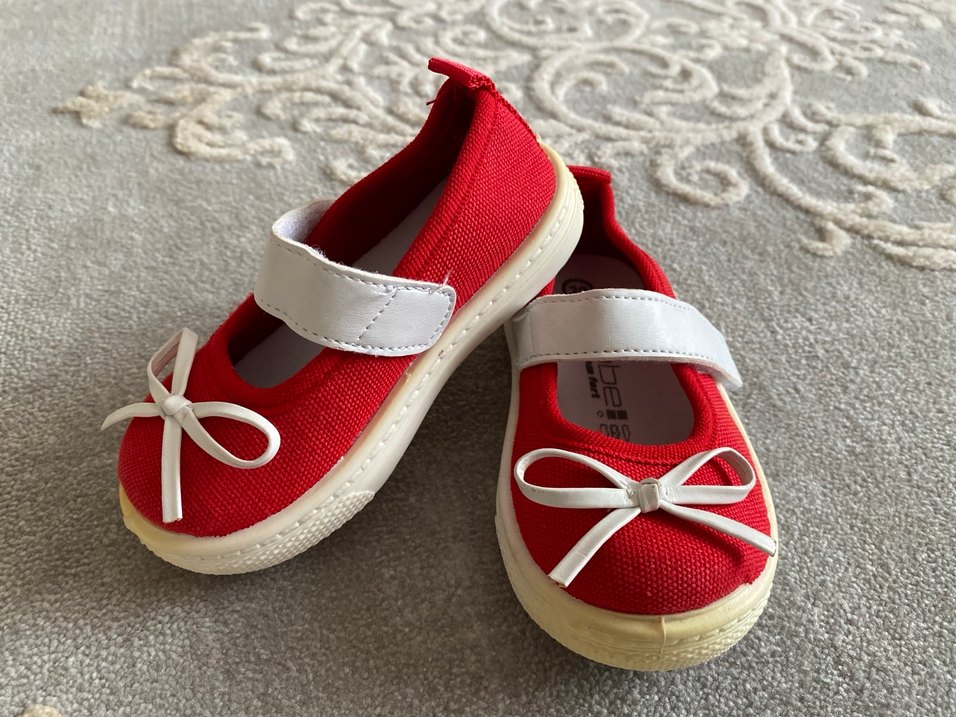 Kız çocuklar için kırmızı kumaş üst kısmı, beyaz cırt cırtlı bant ve süsleme fiyonk detaylı babet. Rahat kauçuk tabanlıdır.