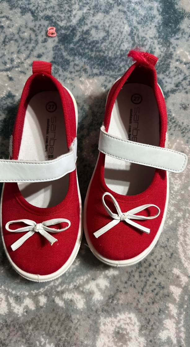 Kız çocuklar için kırmızı babet ayakkabı, cırtlı bant ve yumuşak kauçuk tabanlı, 27 numara. Düz ve renkli, küçük fiyonk detaylı