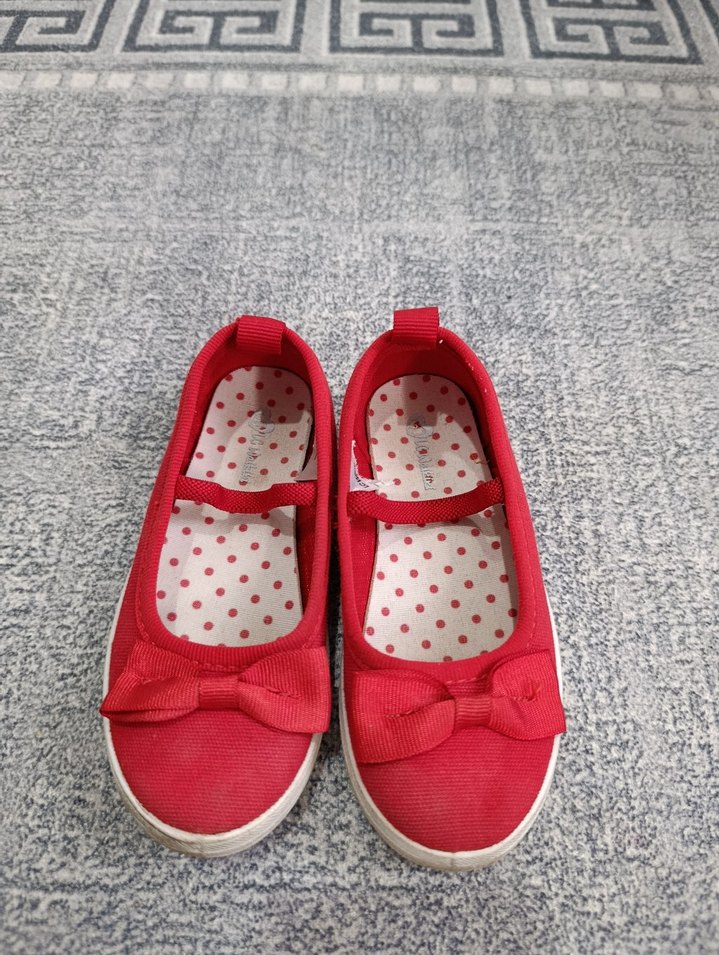 Kırmızı kız çocuk babet ayakkabı, yumuşak kumaş üst yüzey, cırtlı bant ve önünde fiyonk detayı bulunur. İç kısmı puantiyeli desenlidir.