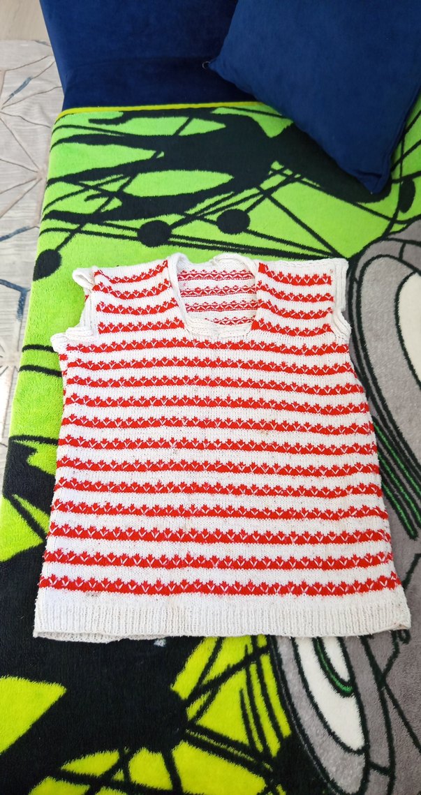 Kız çocukları için renkli kırmızı ve beyaz çizgili, örgü, kolsuz süveter. Salaş kesim ve kayık yaka ile bohem tarzı yansıtıyor.