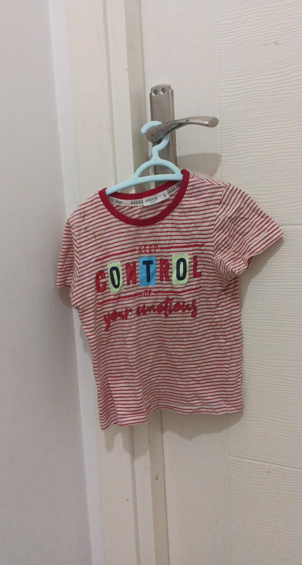 Pamuklu, kısa kollu ve yuvarlak yakalı kız çocuk tişörtü. Pastel kırmızı çizgili, renkli 'CONTROL' baskılı ve düğmeli detaylı, trend sokak giyimine uygun.