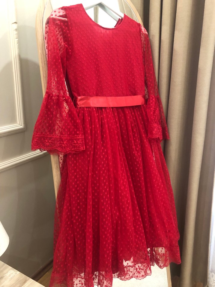 Kız çocuk elbise, uzun dantel kollu ve bol kesimli, yumuşak sentetik kumaştan yapılmıştır. Canlı kırmızı renkte, nakışlı desenli ve klasik yuvarlak yakalı bohem tarzda.(Yalnızca 1 kez giyildi )