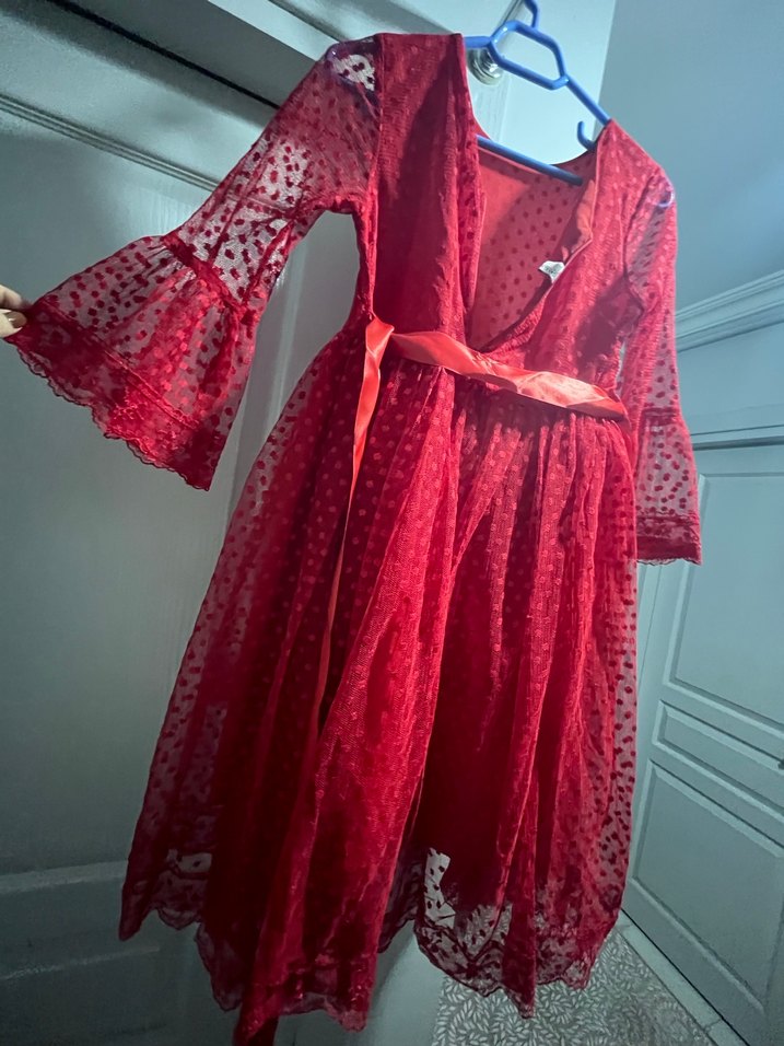 Kız çocuklar için kırmızı dantel kumaştan, V yakalı, askılı kollu, bol kesim bohem elbise. Koyu kırmızı renkte, sentetik dokuda. Bunuda okul için almıştık karne günü giydi o kadar.