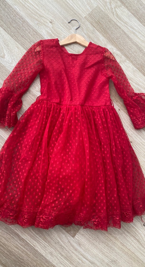 Uzun kollu,kırmızı kız çocuk elbisesi, nakışlı desen ve dantel detaylara sahip, bol kesim ve V yakalı bohem tarzda. Lcw onlıne sitesinden satın alındı .Hiç kullanılmadı