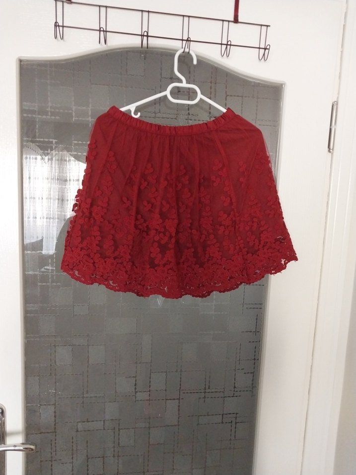 Kırmızı renkte, nakışlı dantel detaylı, sentetik kumaştan yapılmış, bol kesim kız çocuk eteği. Bohem tarzı için ideal.