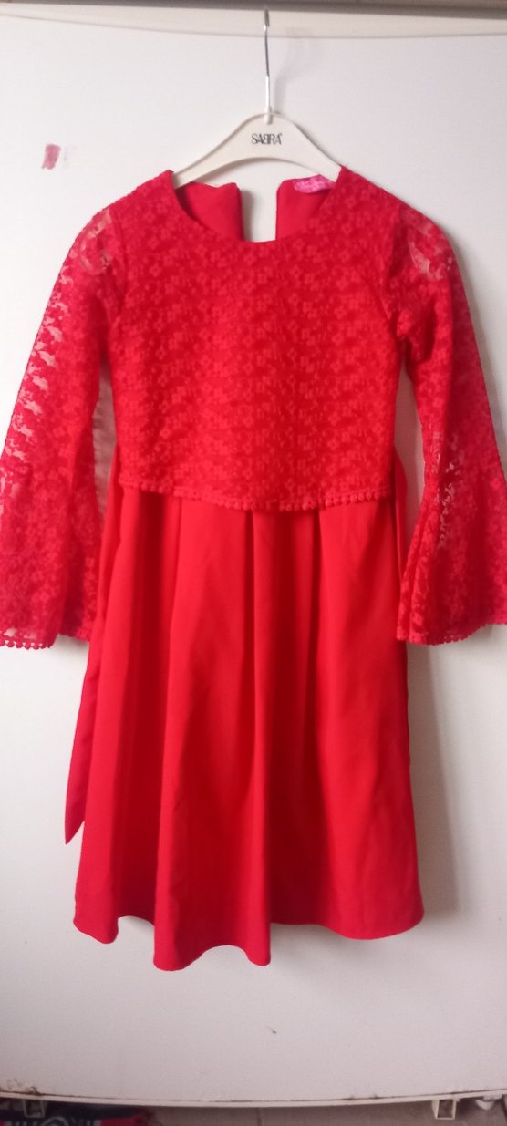 Kız çocuk elbisesi, yüksek yakalı ve uzun dantel kollu, sentetik kumaştan yapılmış, canlı kırmızı renkte, modern klasik tarzda ve normal kesimlidir.