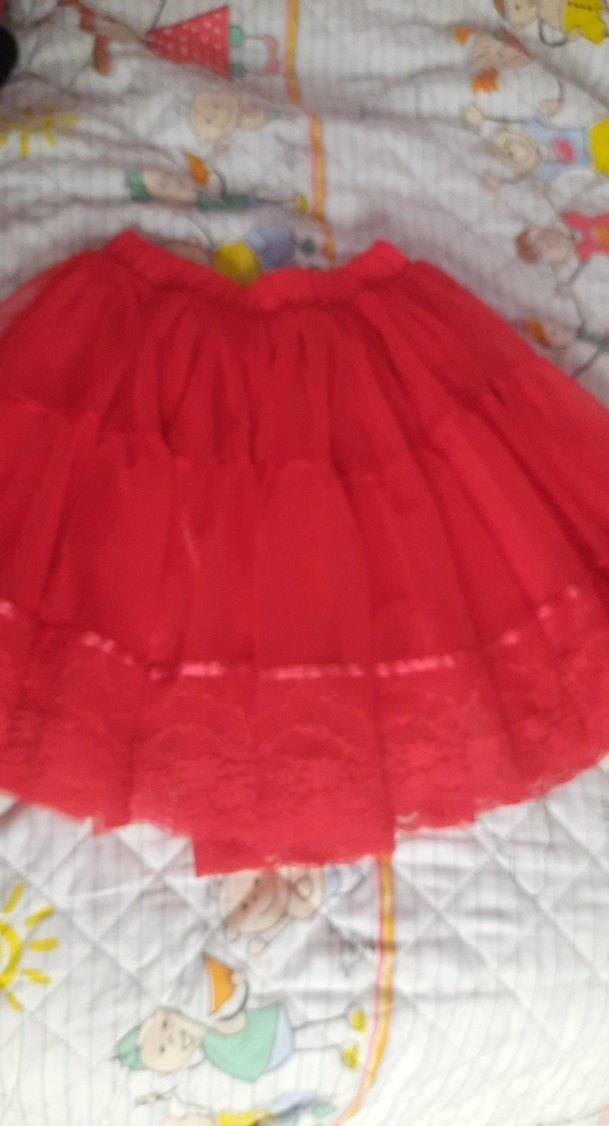 Kız çocukları için kırmızı, fırfırlı tütü etek. kirmızı Renkli, desen içermeyen ve sentetik yumuşak kumaştan yapılmıştır. hiçbir sorunu yok. 7.8 yaş.