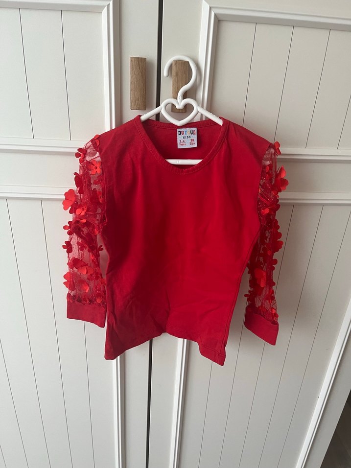 Kırmızı, dantelli uzun kollu, yuvarlak yakalı, ince kesim kız çocuk bluz, triko kumaştan, sokak stiline uygun.