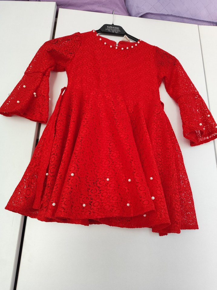 Kız çocukları için kırmızı dantelli elbise, uzun kollu ve vücuda oturan kesime sahip. İnci detayları ve nakışlı desen klasik bir şıklık sunar. ❤️