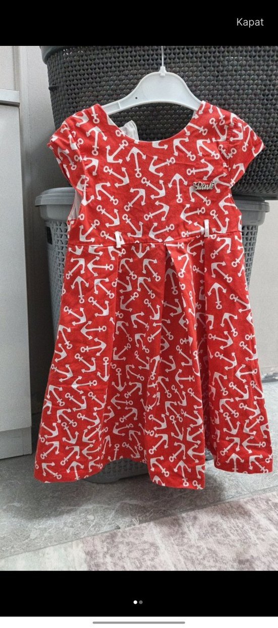 Kız çocuk elbise, bol kesim ve renkli baskılı desenlerle pleat detaylıdır. V yaka ve kısa kolludur, yumuşak sentetik kumaştandır.