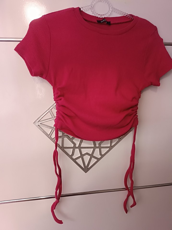 Kız çocukları için dar kesim, yuvarlak yakalı ve drapeli yan detaylı kırmızı tişört. Yumuşak sentetik kumaştan üretilmiştir, sokak modasına uygun.