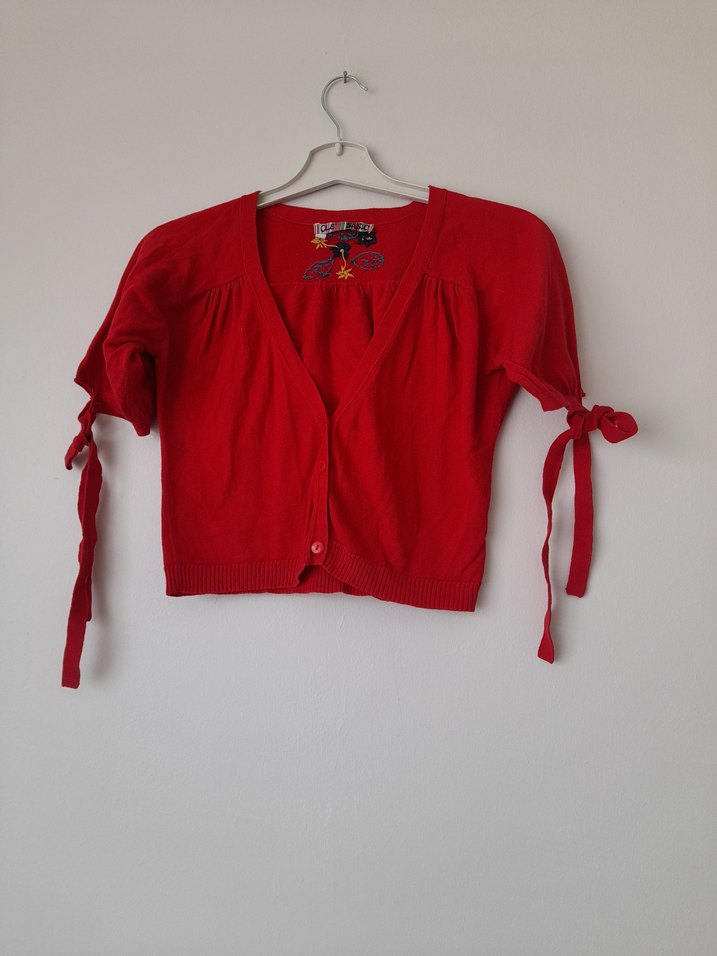 Kız çocuklar için kısa kollu, bağcıklı ve düğmeli kırmızı renkli, yumuşak örme kumaştan yapılmış, bohem tarzına uygun bolero.