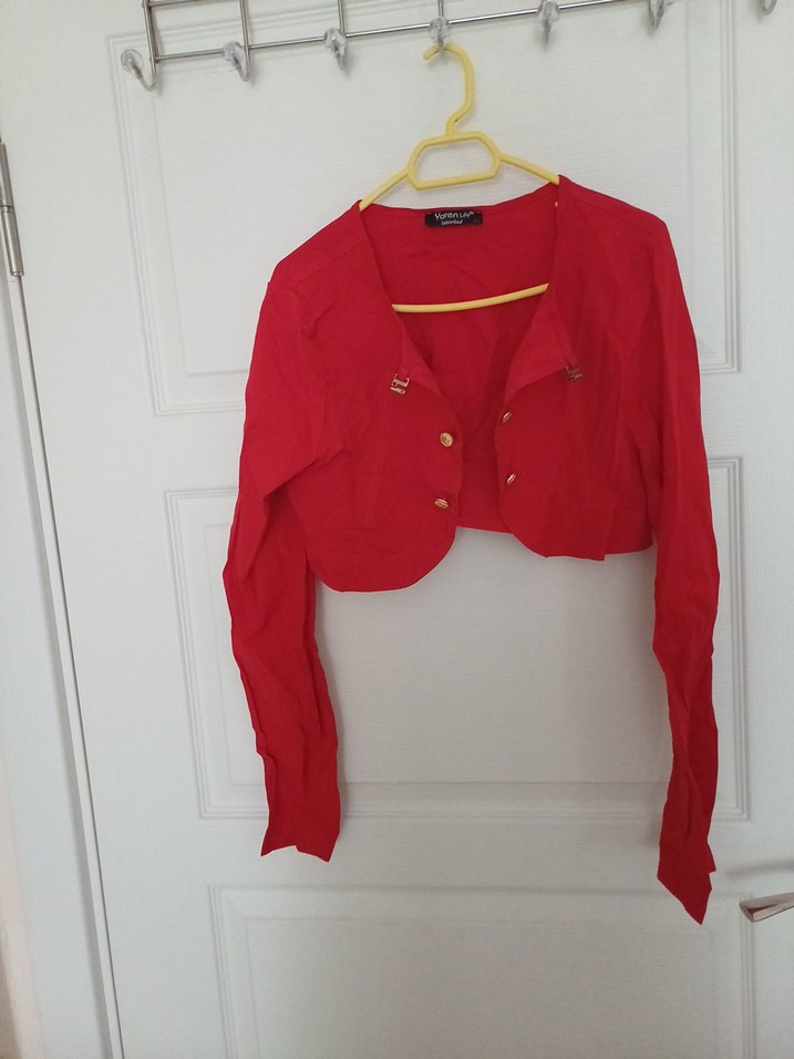 Uzun kollu, yakalı ve düğmeli kız çocuk bolero. Satenimsi parlak kırmızı kumaştan, cesur sokak stili için uygun.