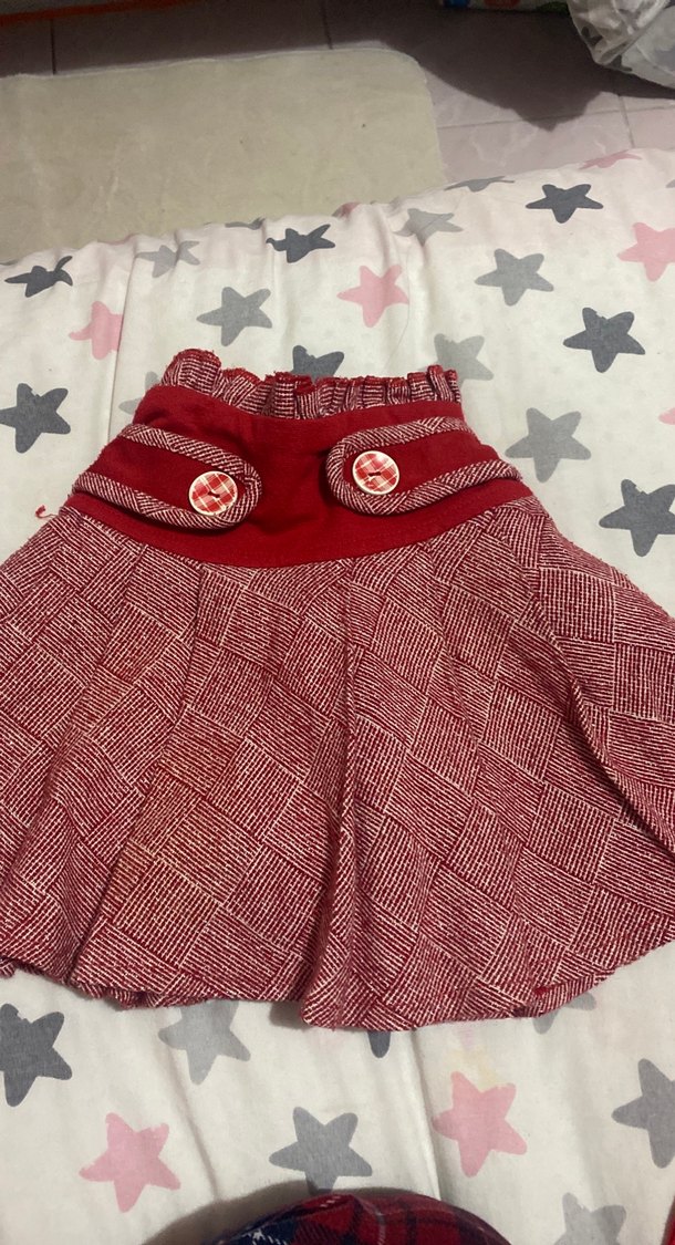 Kız çocukları için kırmızı, düğmeli ve bol kesim bir etek. Yumuşak dokulu kumaştan yapılmıştır, renkli ve özgün bir görünüme sahiptir.