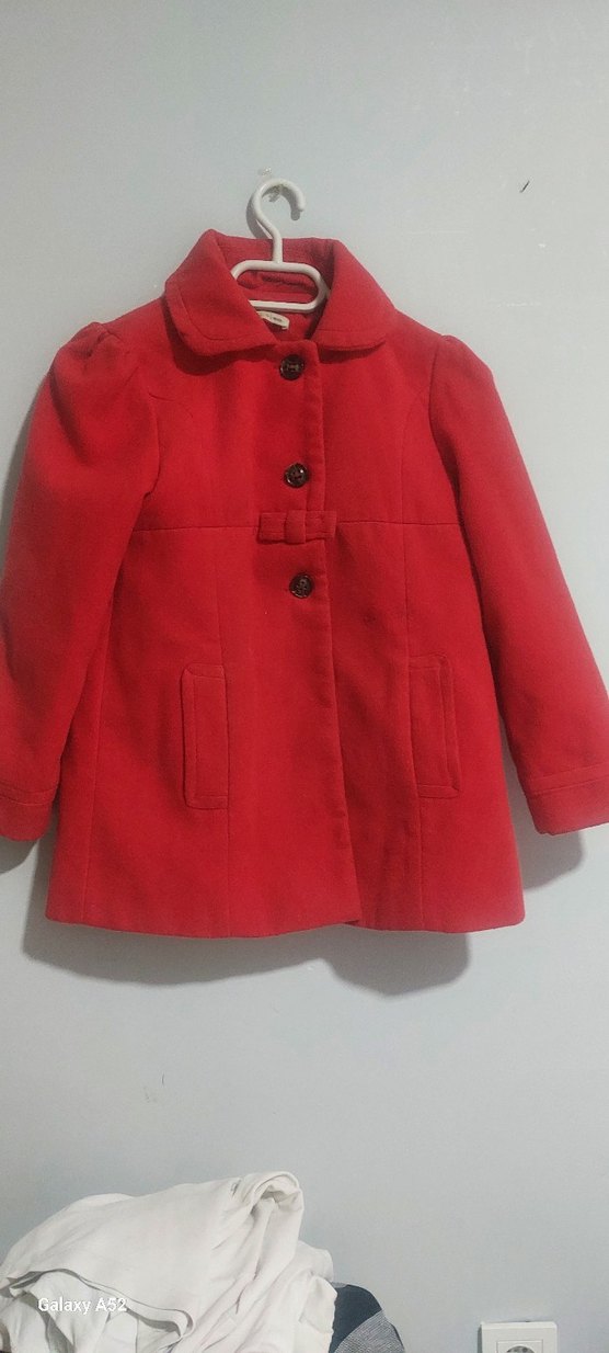 Kız çocukları için kırmızı düğmeli kaban, kesimli yakada sökük varso foto koydum.yıkanabilir sadece 1 kez yıkadım