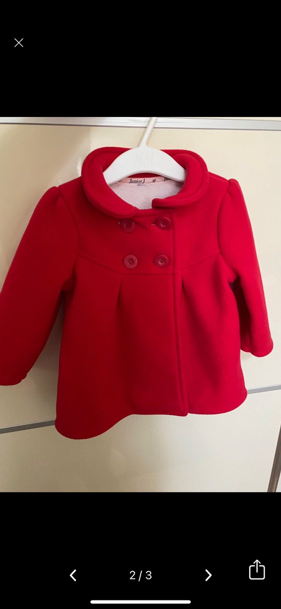 Kız çocuklar için kırmızı, düğmeli ve yumuşak, sıcak tutan kumaştan yapılmış, kesimi oturan bir kaban.