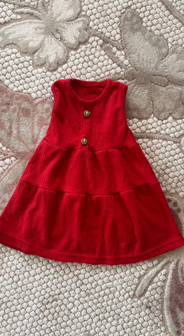 Kız çocuklar için renkli kırmızı kolsuz elbise, yüksek yakalı ve düğmeli ön detaylıdır.