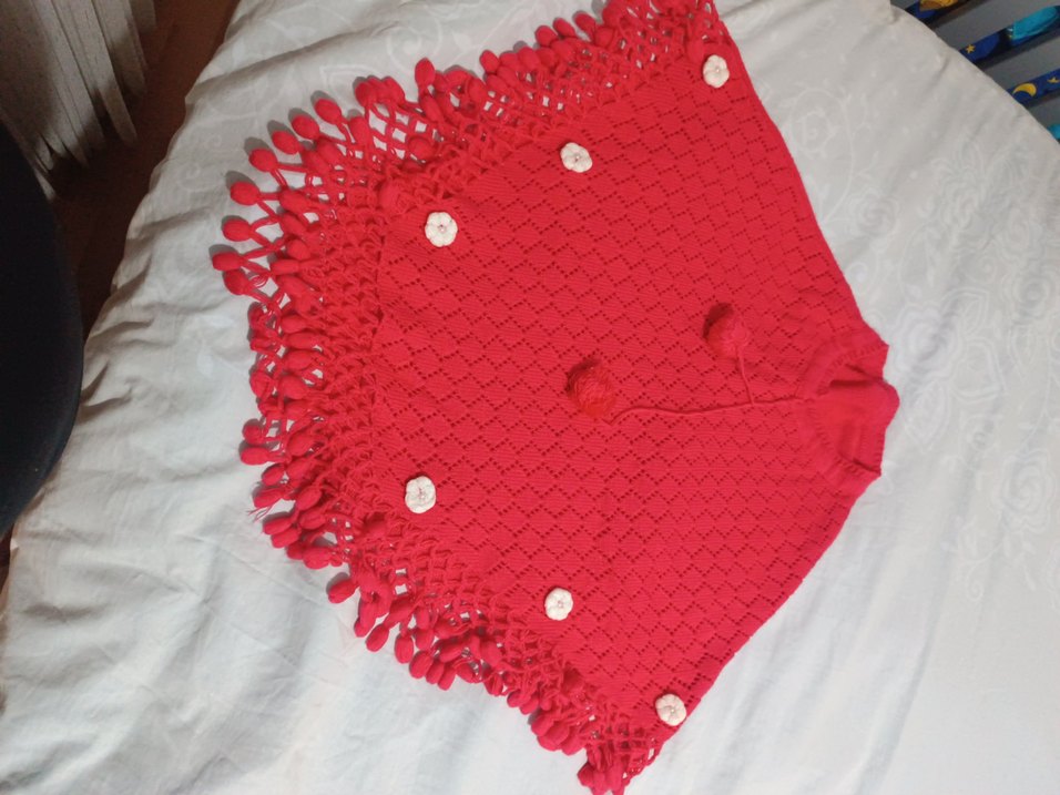 Kız çocuk için kırmızı renkli, tekne yaka, kolsuz, bol kesim örgü panço. Nakışlı desenli ve düğmeli detaylıdır.
