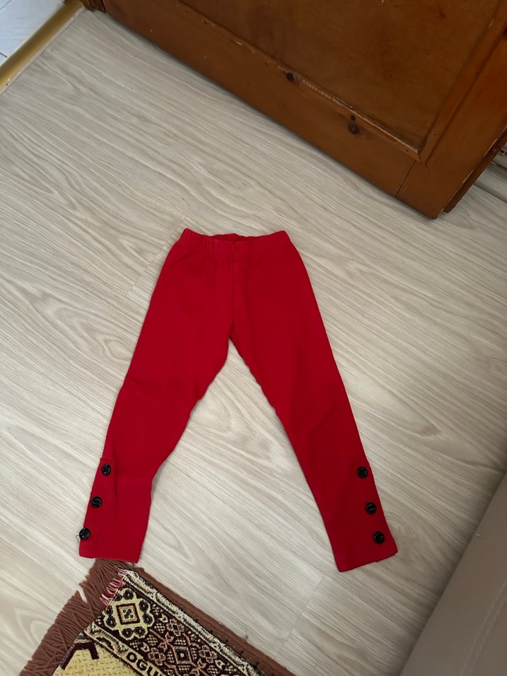 Kırmızı renkli, düğme detaylı ve rahat kesime sahip, yumuşak ve sıcak kumaştan üretilmiş kız çocuk taytı. Sokak tarzı için uygun. 3 tane