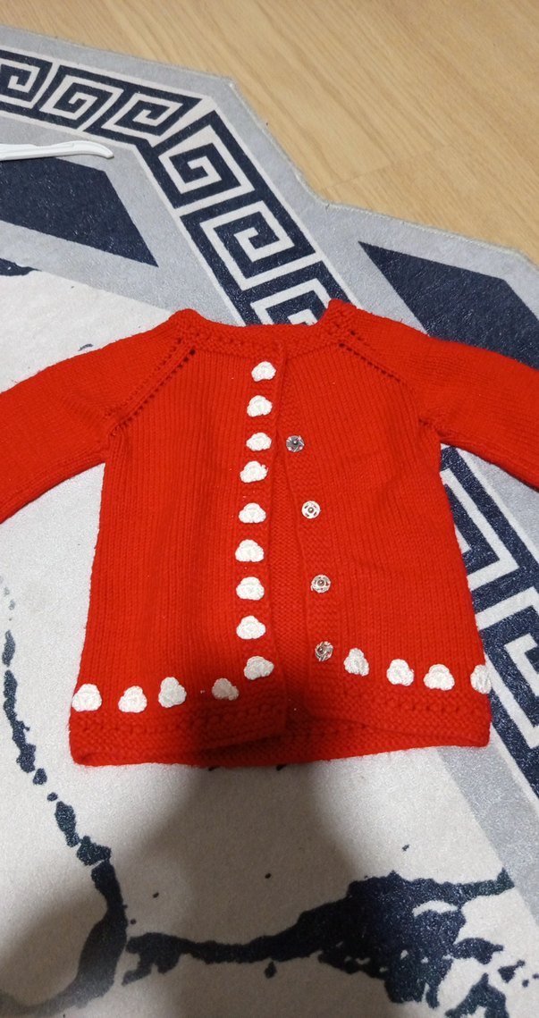 Kız çocuklar için uzun kollu, düğmeli ve beyaz detaylı kırmızı triko hırka. Sade ve renkli tasarıma sahip.