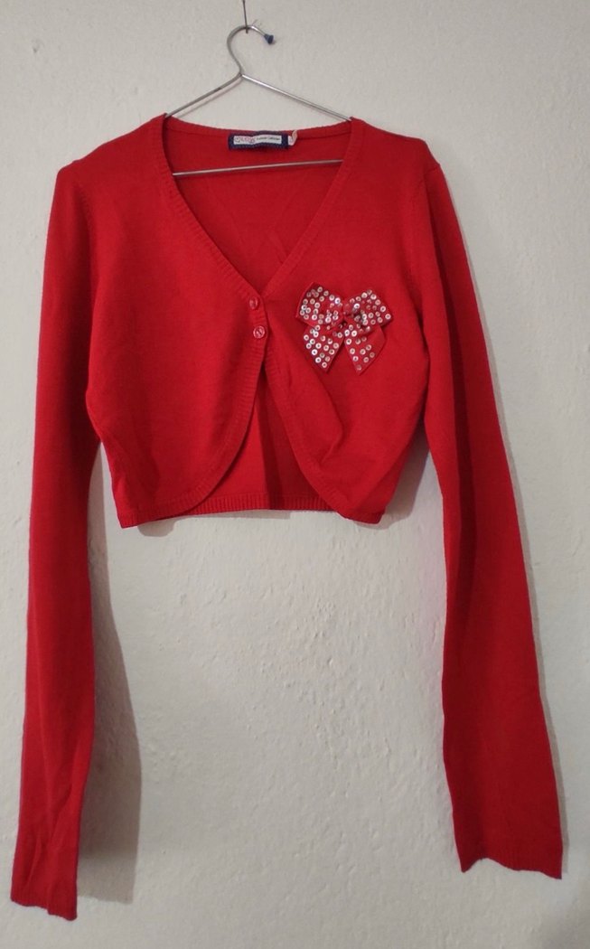 Parlak kırmızı renkli, uzun kollu, düğmeli ve V yakalı kız çocuk bolero. Yanında boncuklu fiyonk detayına sahiptir, trend sokak stili için uygun.