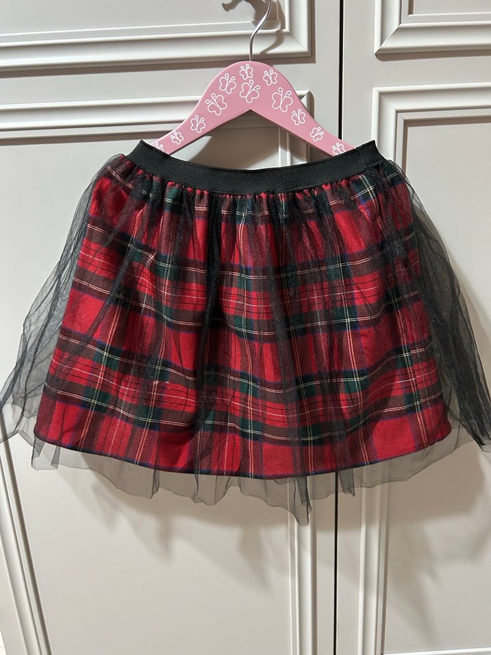 Koyu kırmızı ekose desenli, pilili ve şeffaf siyah tül detaylı, fitted kesim kız çocuk eteği, goth tarzıyla klasik görünümü birleştiriyor.