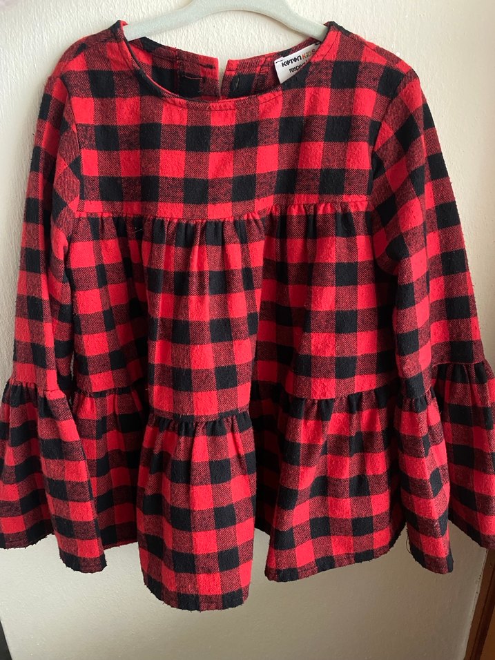 Kız çocuk için uzun kollu, yuvarlak yakalı, bol kesimli ve fırfırlı detaylara sahip kırmızı ekose. Yumuşak ve sıcak kumaştan üretilmiştir. Çok az kullanıldı. Yeniden farksız