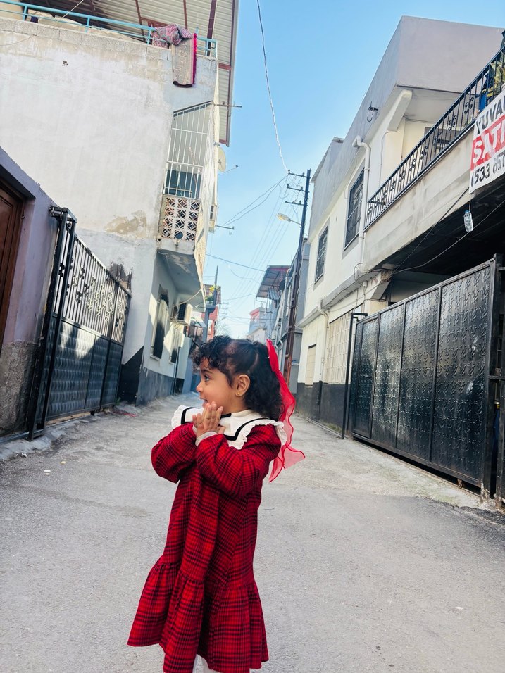 Kırmızı ekose desenli, pamuklu kumaştan yapılmış, puf kollu ve halter yaka uzun kollu kız çocuk elbisesi, rahat bol kesimlidir. ✨