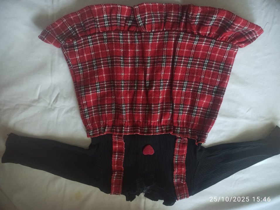 Dar kesim kırmızı ekose kız çocuk elbise, düğmeli, askılı ve boğazlı yakaya sahip gotik tarzda, eski moda görünüm sunar.