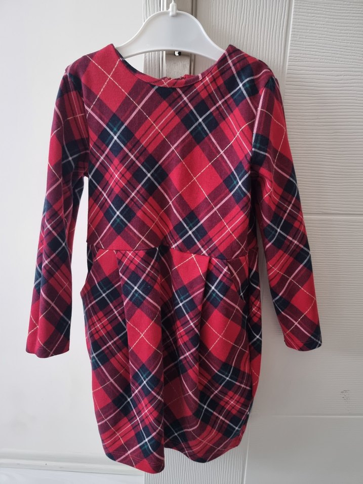 Kız çocuk elbisesi, uzun kollu ve bisiklet yaka, yumuşak ve sıcak kumaştan, bol kesim ve pileli tasarıma sahip. Koyu kırmızı ekose deseni bulunur.