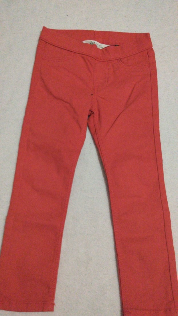 Kırmızı, elastik bel bantlı kız çocuk pantolonu. Pürüzsüz sentetik kumaştan, renkli ve desensiz, rahat normcore tarzında.