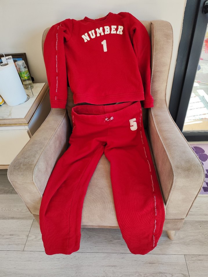 Yumuşak ve sıcak kumaştan üretilmiş, bol kesim kırmızı kız çocuk eşofman takımı. Uzun kollu ve yuvarlak yakalı, beyaz 'NUMBER 1' ve '5' baskılarıyla sade ve şık görünüm sağlar.