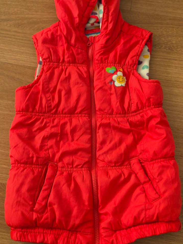 Kız çocukları için kırmızı, kapüşonlu ve fermuarlı yelek. Yüksek yakalı, renkli nakış detaylı ve sıcak tutan yumuşak kumaştan yapılmıştır.