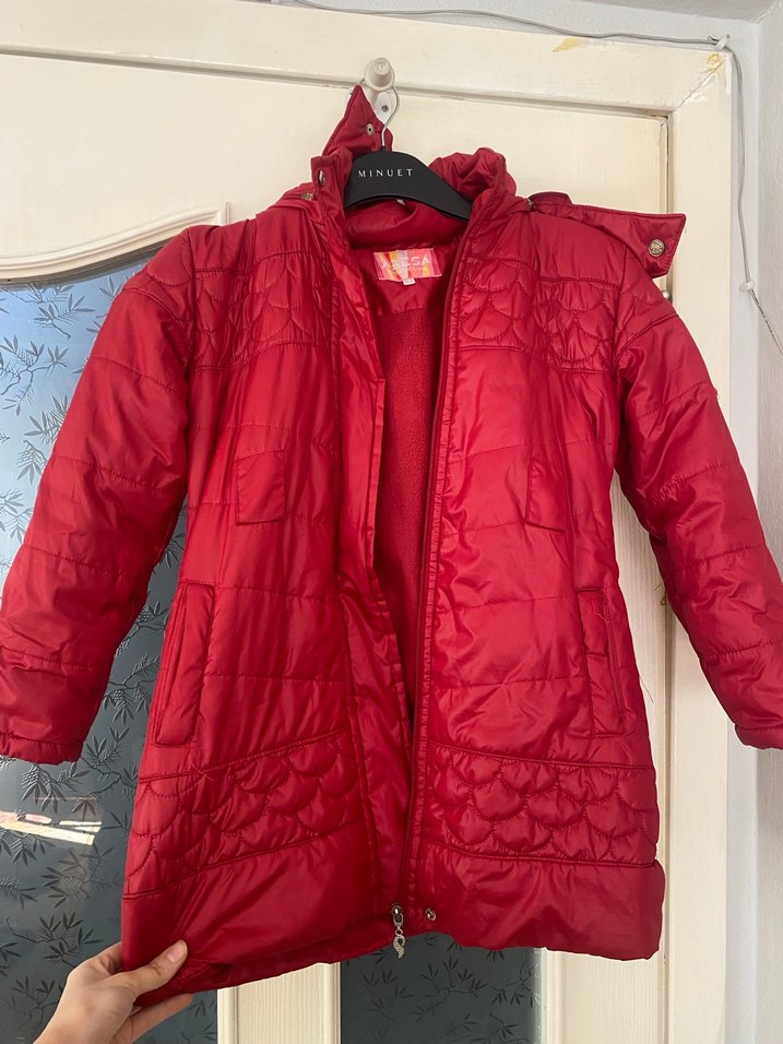 Kız çocukları için parlak kırmızı, fermuarlı, yumuşak ve sıcak kumaştan yapılmış, yakası kesik detaylı, dar kesim kaban.
